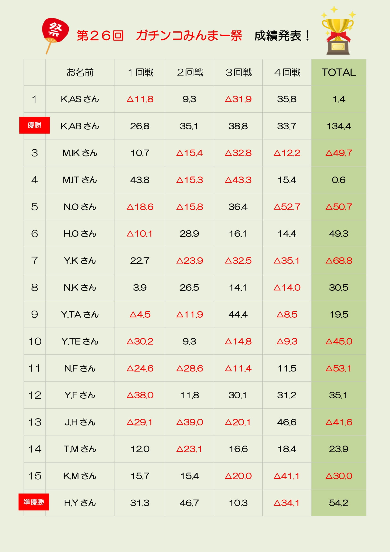 - 【幕張】第26回ガチンコみんまー祭 成績発表!