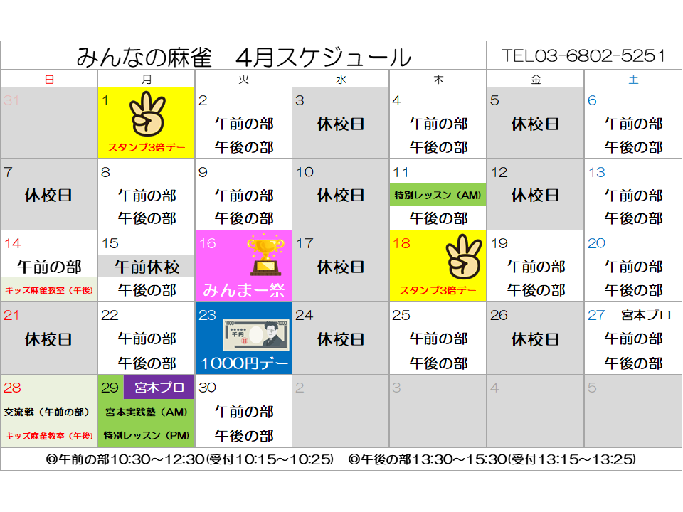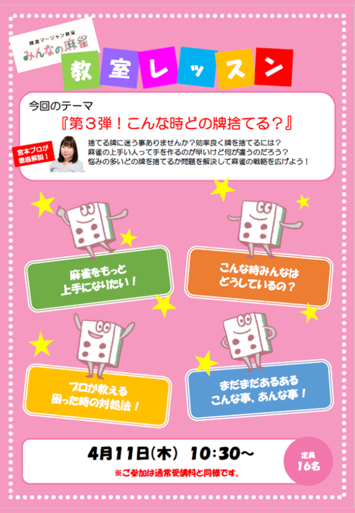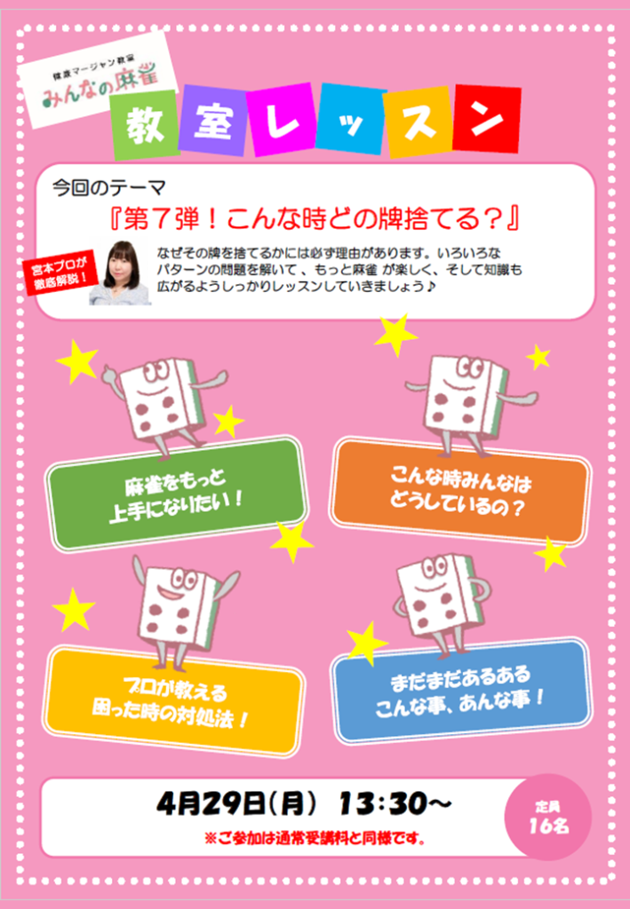 また、今月の宮本先生のイベントレッスンは「こんな時どの牌捨てる?第3弾(リピート)」を4月11日に、「こんな時どの牌捨てる?第7弾」を4月29日に開催します!