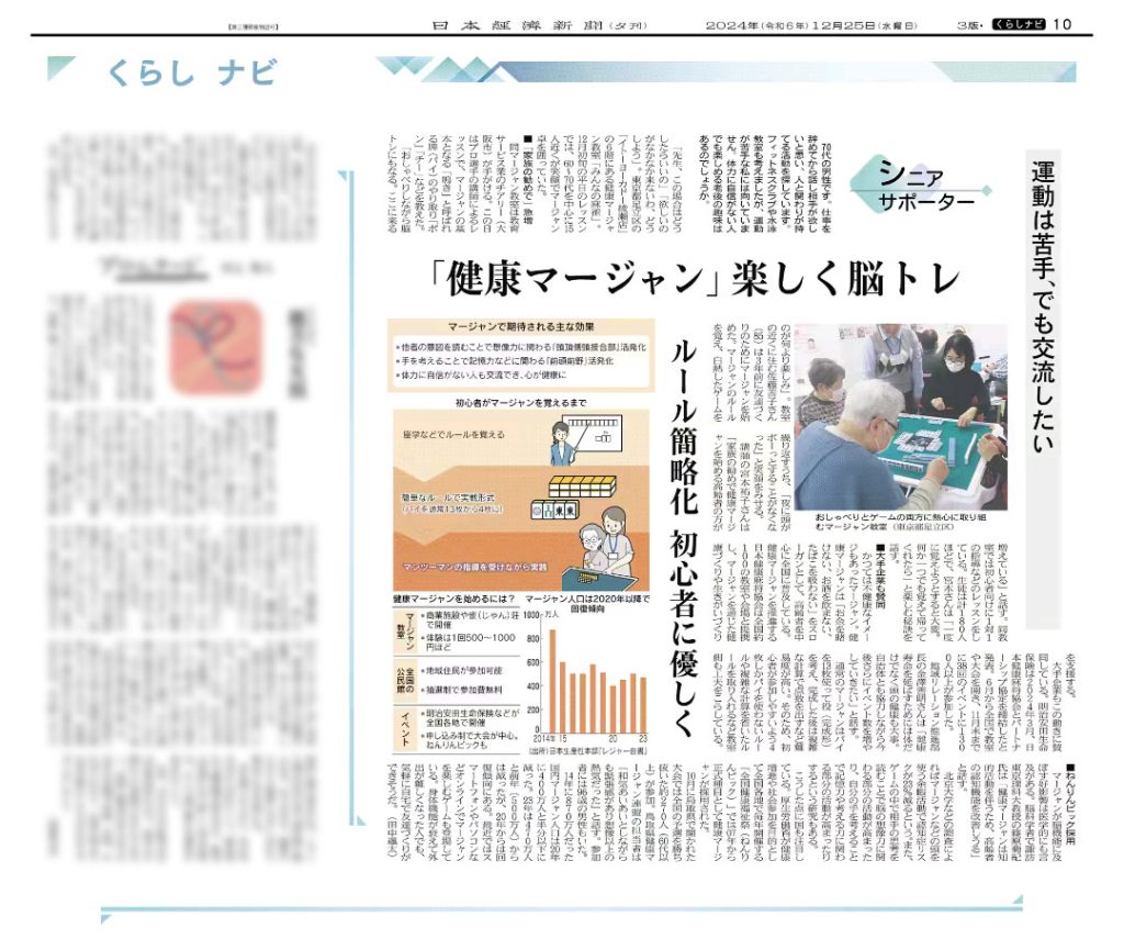 2024年12月25日に発行された、日本経済新聞 夕刊10面の「くらしナビ」で、みんなの麻雀 イトーヨーカドー綾瀬教室 が紹介されました。
