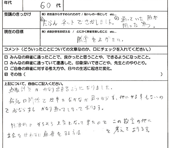 - 東京都足立区 60代男性 健康麻雀教室アンケート