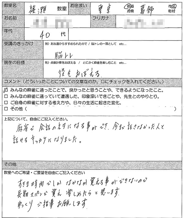 葛飾区にお住まいの40代女性の受講生さまからアンケートをいただきました。