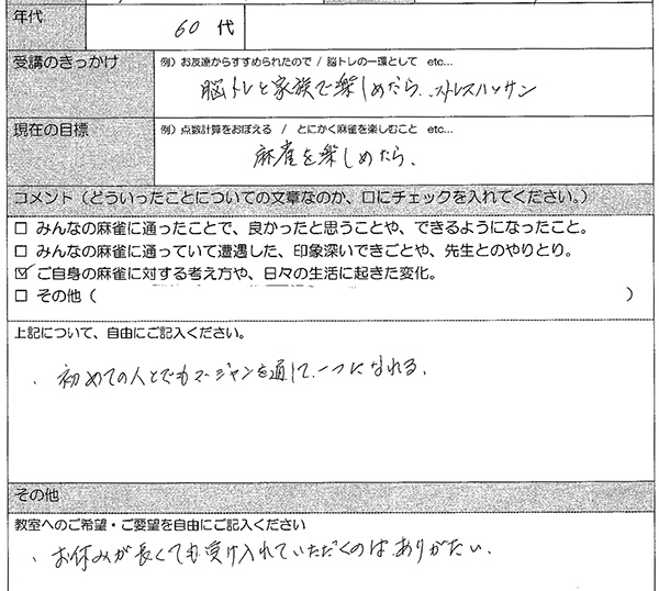 葛飾区にお住まいの60代女性の受講生さまからアンケートをいただきました。