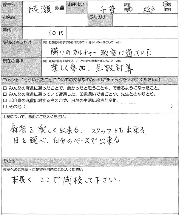 千葉県松戸市 60代女性 麻雀教室アンケート