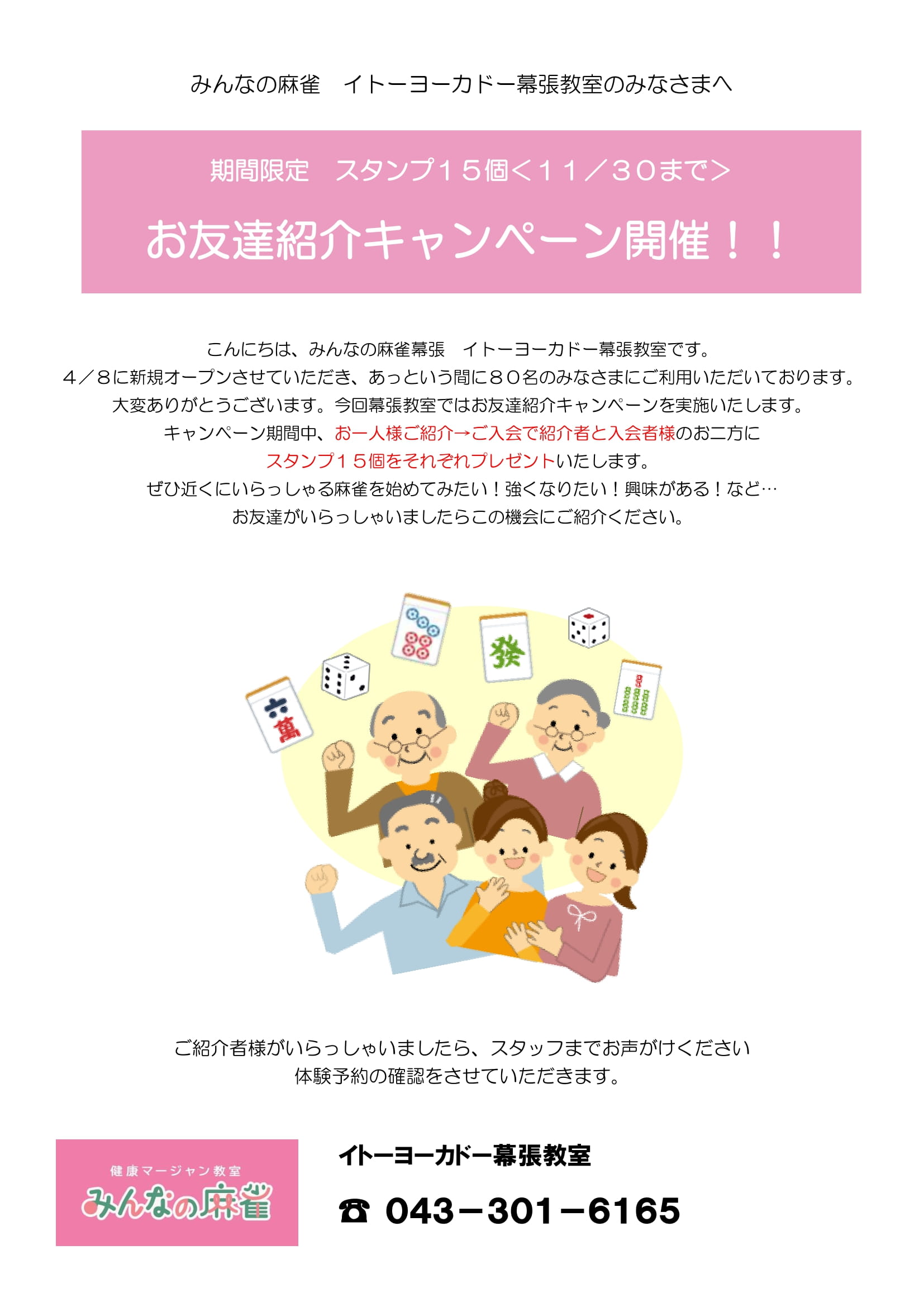 千葉県千葉市花見川区のイトーヨーカドー幕張店2Fにある健康麻雀教室「みんなの麻雀」幕張教室です。「日本一女性と初心者に優しい、笑顔があふれる教室」がコンセプト。詳しくは⇒こちら