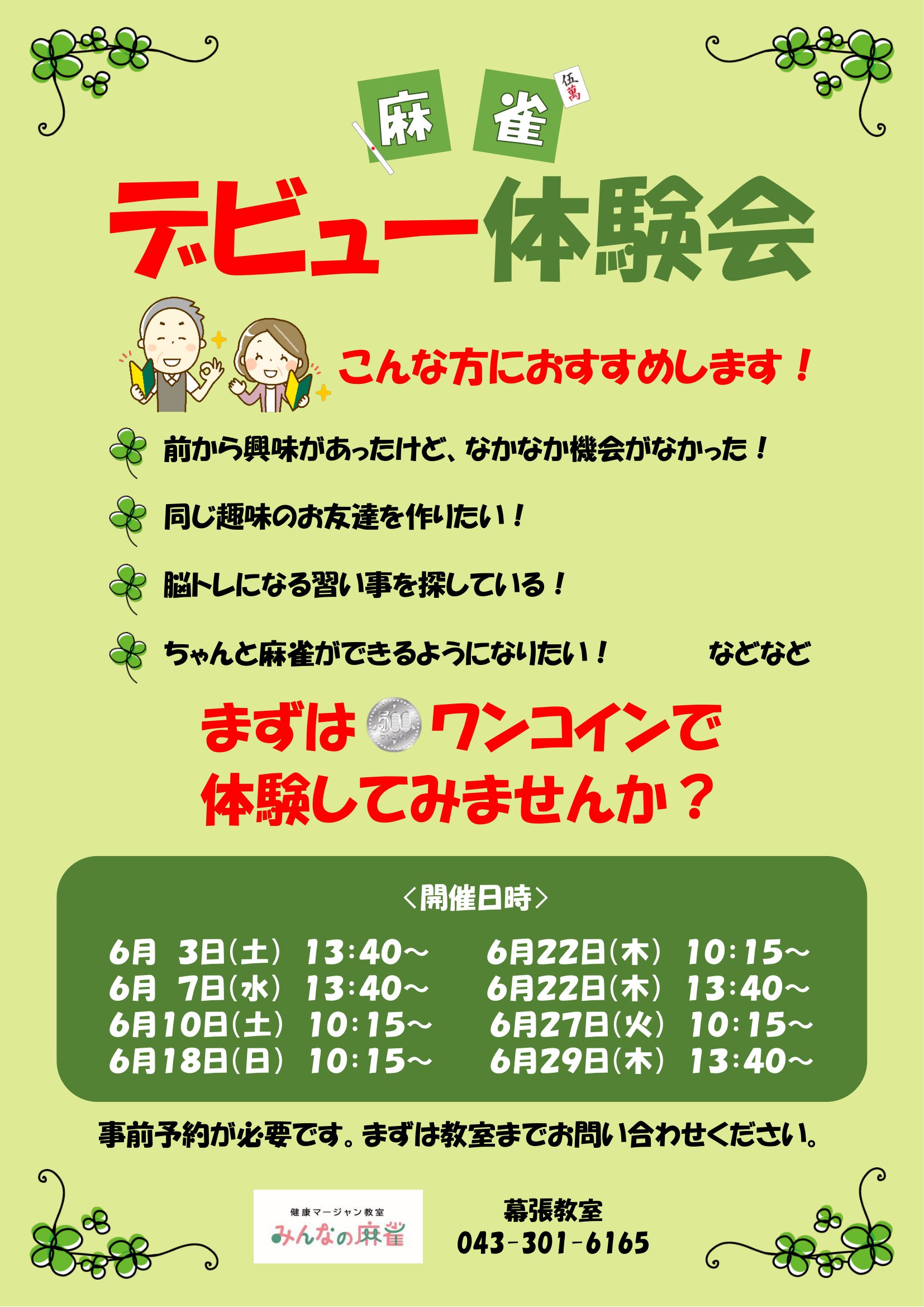 千葉県千葉市花見川区のイトーヨーカドー幕張店2Fにある健康麻雀教室「みんなの麻雀」幕張教室です。「日本一女性と初心者に優しい、笑顔があふれる教室」がコンセプト。詳しくは⇒こちら