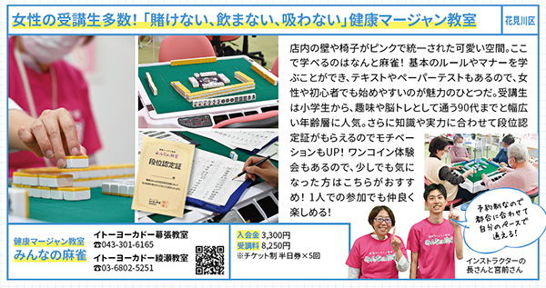 千葉県のタウン情報誌「月刊ぐるっと千葉」2023年10月号の「ジモトでおすすめの習い事」特集ページで、みんなの麻雀 イトーヨーカドー幕張教室が紹介されました。