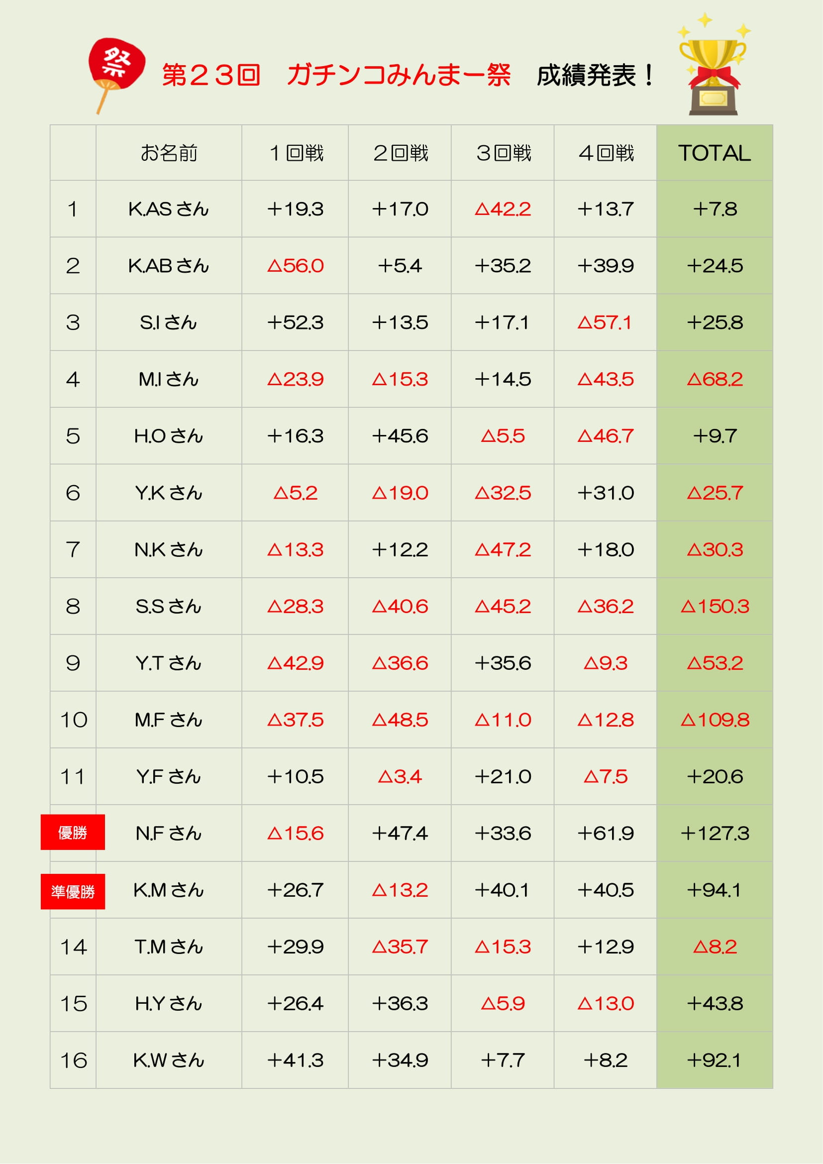 優勝は・・・N.Fさん!最終4回戦目で大きなアガりを決めて逆転で優勝となりました。おめでとうございます!