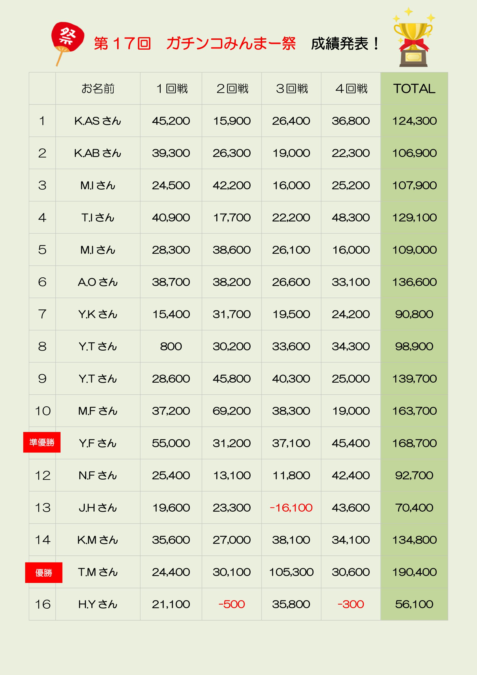 - <幕張>第17回ガチンコみんまー祭成績発表!