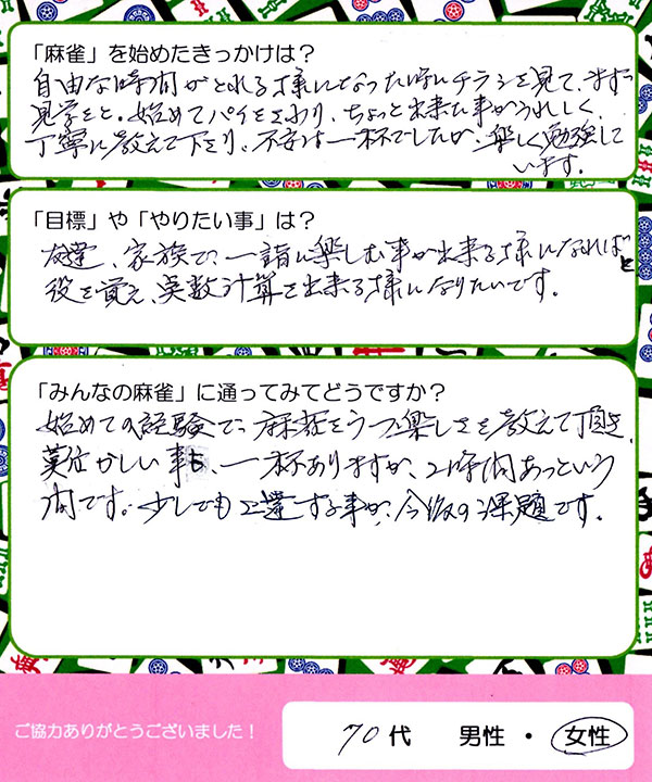 - 千葉市花見川区 70代女性 麻雀教室アンケート