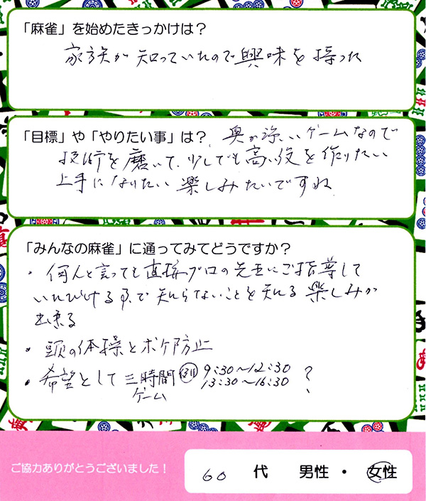 千葉県千葉市美浜区 60代女性 麻雀教室アンケート